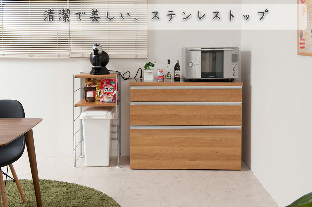 是非一度ご覧ください!清潔で美しい、ステンレストップキッチンカウンター キッチン収納 レンジ台 カウンターテーブル レンジボード商品詳細 品名ステンレストップシリーズ キッチンカウンター幅110サイズ本体:(約)幅110×奥行45×高さ87.5cm引出し内寸:幅100×奥行32.5×深さ(上)7.5〈有効11.5〉、(中)16.5〈有効19〉、(下)16.5〈有効33〉cm梱包サイズ:115×50×92cm重量42kg材質前板:強化プリント紙化粧繊維板、天板:ステンレス貼り、その他:プリント紙化粧付属品2口コンセント(合計1500W・コード長さ170cm)生産国日本耐荷重量天板:(約)20kg備考完成品キャッチコピー清潔で美しい、ステンレストップ関連ホワイト 木目調 ナチュラル ステンレストップ 天板ステンレス 背面化粧仕上げ コンセント付き 3段 大容量 フルスライドレール 国産 完成品 幅110cm 高さ87.5cm 奥行45cm おしゃれ シンプル モダン